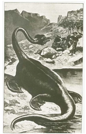 The Elasmosaurus is a prehistoric reptile found to inhabit the depths of Lake LaMetrie, a mysterious freshwater body located in a volcanic crater, "high up in an almost inaccessible part of the mountains of Wyoming", and known to produce prehistoric specimens such as plate-covered fish. The lake's discoverer, Father LaMetrie speculated that it may be connected to a hidden interior world of prehistoric survivors within the Earth's crust.